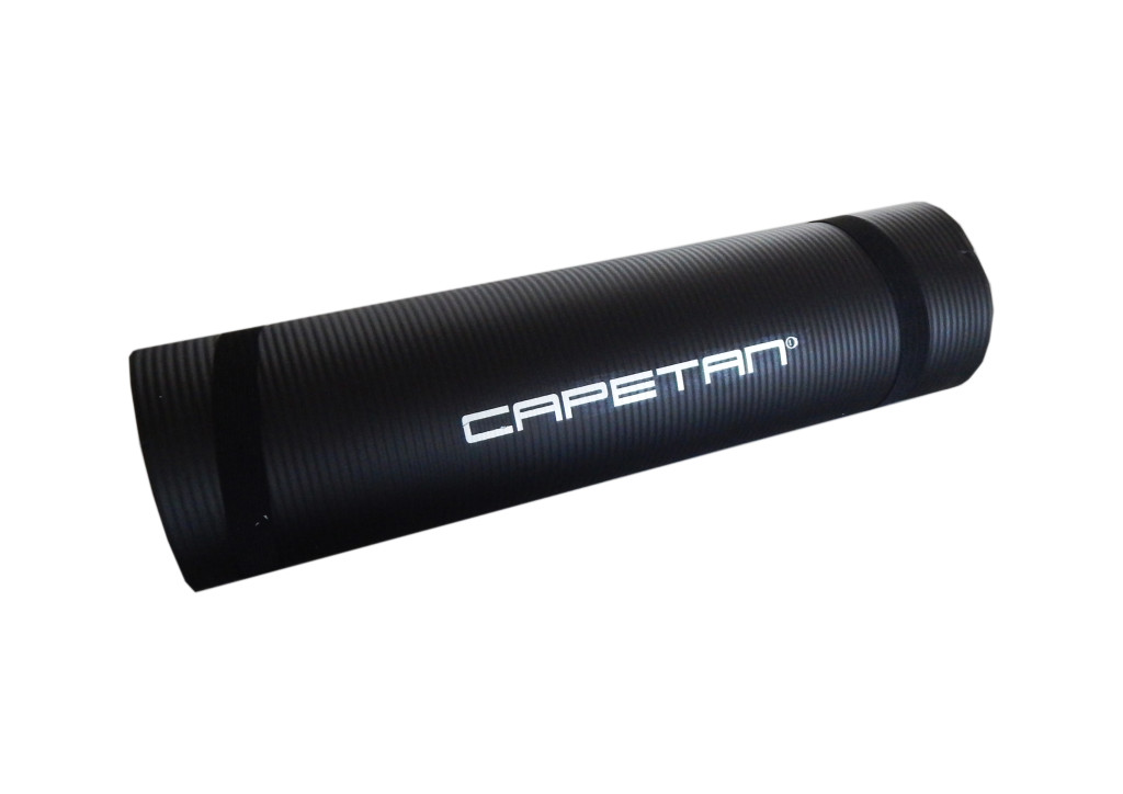 Capetan® Professional Line NBR fitnesz szőnyeg akasztógyűrűkkel 180x61x1cm méretben, Fekete színben elasztikus hordpánttal