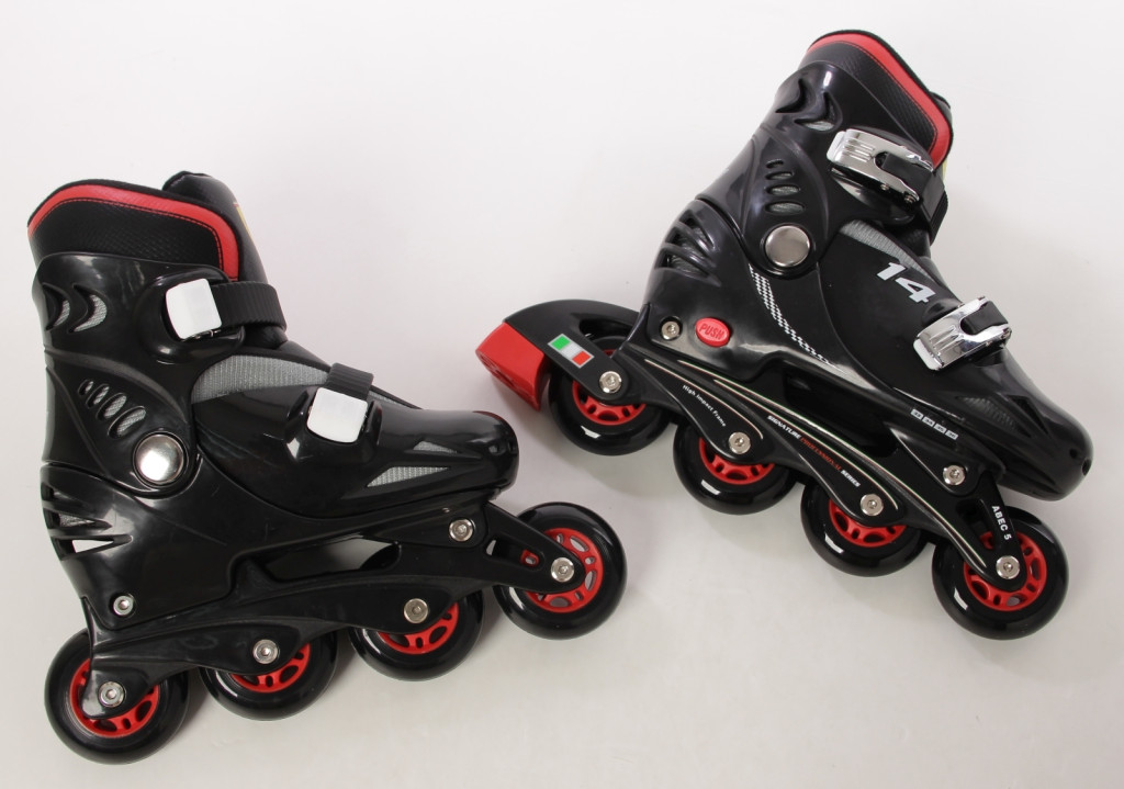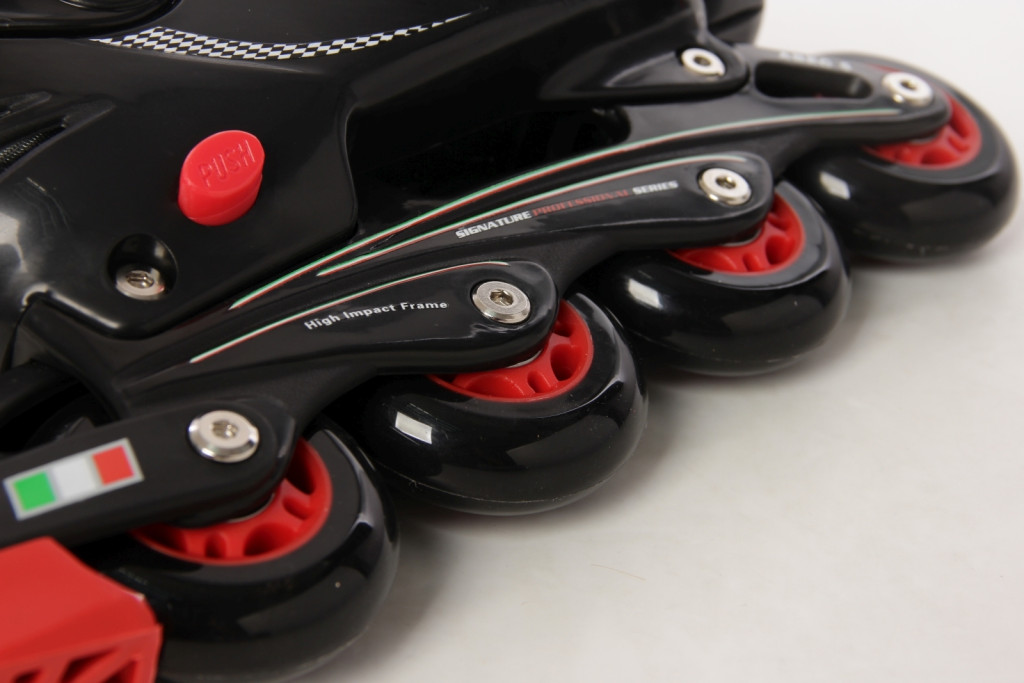 Egy nyomógombbal egyszerűen állítható cipőméret beállítás, kétpontos , részben fém csatos rögzítés, Abec 5 csapágyazás, műanyag cipőrész , magasellenállású compozit vázszerkezet