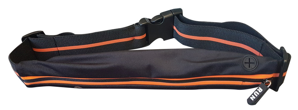 Futóöv mobiltelefon tárolásához, fülhallgató hellyel, 65-110 cm derékméret között, 6 cm széles narancs-fekete színben.