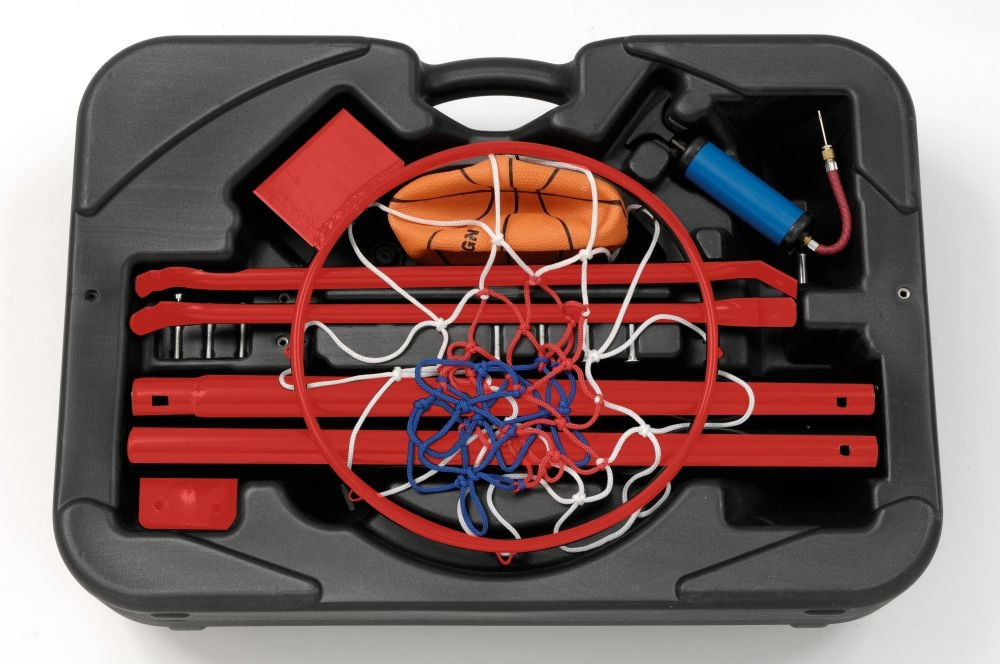 Otthoni és Strand játék kosárállvány hordozható kivitelben gyerekeknek. Az állványt különösen könnyű összecsukni és fogantyújánál fogva bőröndként magunkkal vinni egy hétvégi campingezés alkalmával. A kosárállvány magasság a gyűrűig 165 cm, gyermekszobába akár télen is felállítható.