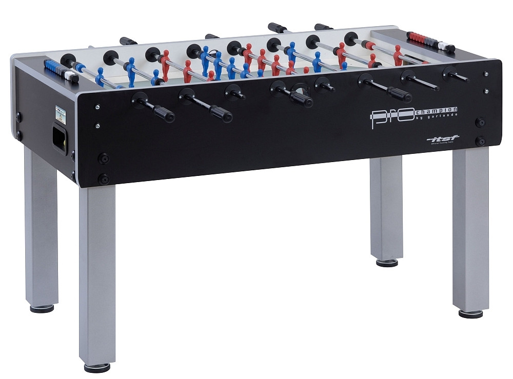 A versenycsocsó asztal rudazatai golyóscsapágyas tokban gördülnek, melyek jelenléte gyorsabbá teszi a játékot anélkül hogy a játékos csuklóját megerőltetné. Az asztalifoci berendezést 3 db "Speed Ball" versenylabdával szállítjuk. 360 fokban versenyszabványok szerint elforduló kapussal rendelhető Garlando Pro Champion asztalifocira 3 év garancia vonatkozik. A bábuk kék-piros színkombinációban érhetők el. A játéktér homokfújt tükröződésmentes üveglappal burkolt, melyen a labda jobb tulajdonságokkal mozog mint a laminált felületű játéktereken. A találatszámláló versenyszabványoknak megfelelő kivitel.