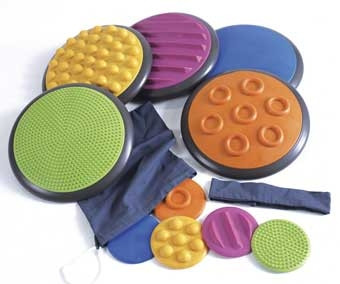 Gonge érzékelő korongok, 5 darab nagy, 5 darab kicsi korong strukturált mind-mind más felülettel, a nagykorongra lépve ki kell választani kézzel a zsákból az azonos mintájút a kicsik közül. A korongok színe is eltérő.