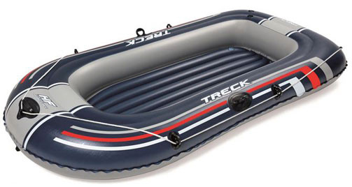 Kétszemélyes két felnőtt használatára tervezett max.170 kg-ig terhelhető 3 légkamrás csónak, javító folt mellékelve.