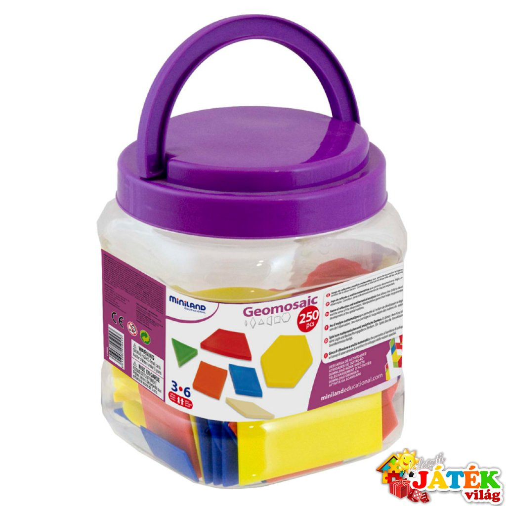 250 geometrikai alakzat törhetetlen műanyagból, 6 különböző színben. Előnyben részesíti a térbeli érzékelést és a vizuális koordinációt. Mozaik darabkákként is használhatók.