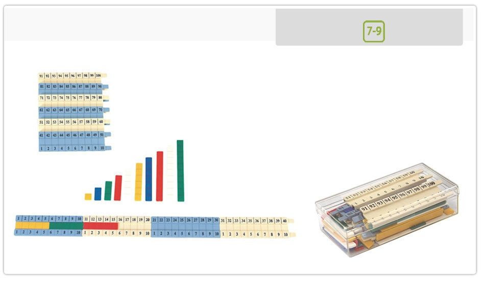 A csíkok segítik a 10-es számrendeszer megértését.A külünböző számszakaszokat különböző színű és méretű csíkokkal lehet kitölteni.A számsorok egymással összeilleszthetőek.