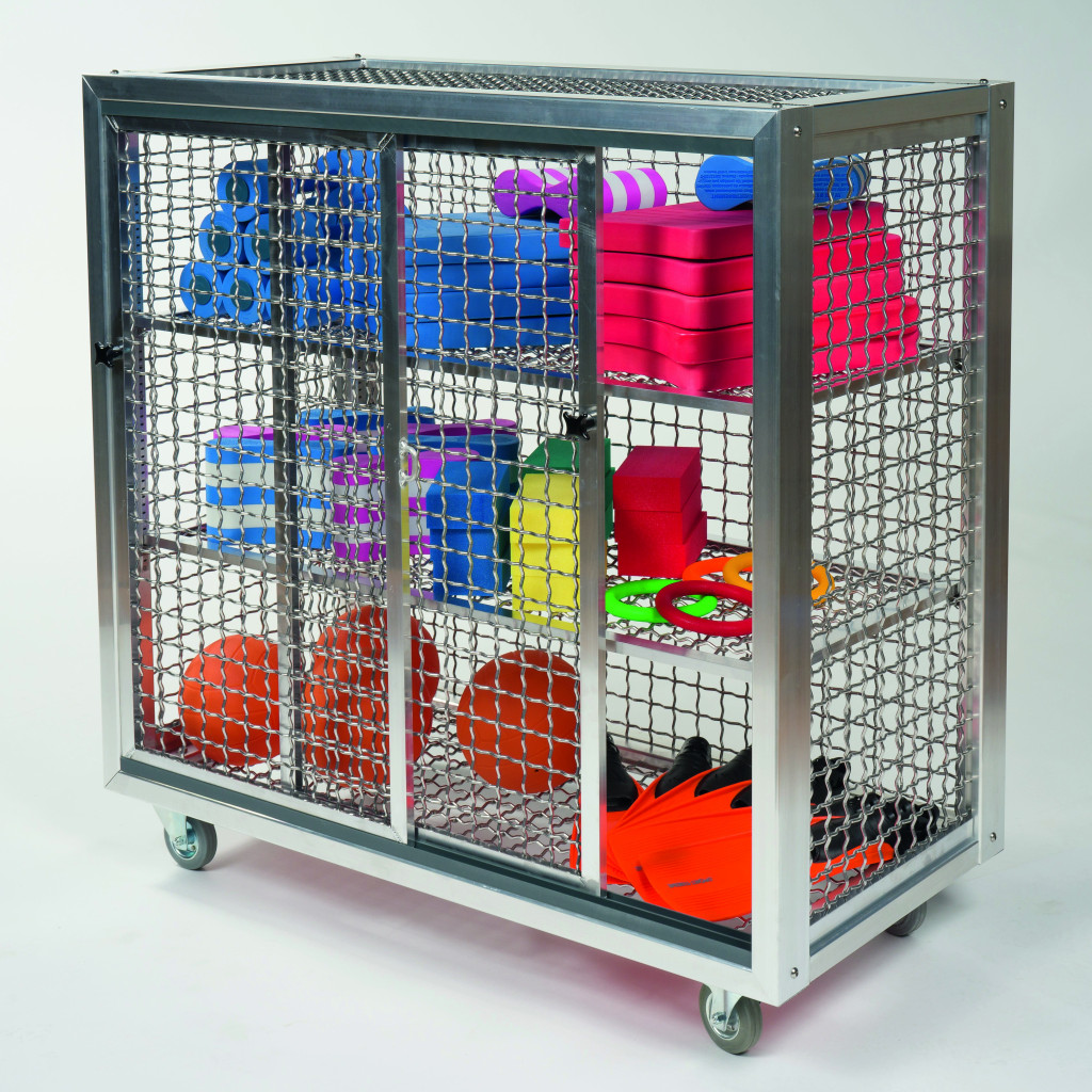 Nagy teherbírású alumínium kocsi, erős hálóráccsal és csúsztatható tolóajtóval. Nyitott tároló található a tetején. 2 kereke, illetve 2 görgővel rendelkezik, amely fékkel fixálható.